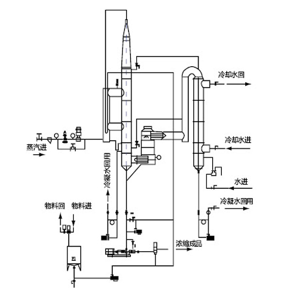 本設(shè)備采用降膜蒸發(fā)形式。該設(shè)備主要由蒸發(fā)器、分離器、冷凝器等幾部分組成,廣泛用于食品、生物、制藥、化工等行業(yè)的濃縮、脫水等,控制分為手動控制和自動控制兩種方式。